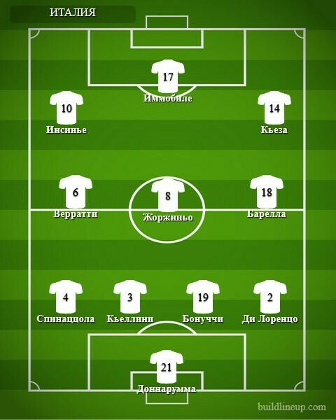 Италия: Доннарумма, Спинаццола (Эмерсон, 79), Кьеллини, Бонуччи, Ди Лоренцо, Верратти (Кристанте, 74), Жоржиньо, Барелла, Инсинье (Берарди, 79), Иммобиле (Белотти, 74), Кьеза (Толой, 90+1).
