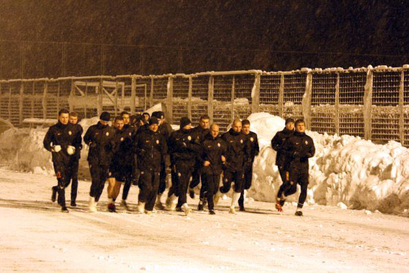 Тренировку футболисты начали с игры в...- снежки! Но до тех пор, пока к ним не вышел тренерский штаб :) Потом разминка, круги, «квадрат» и СМИ попросили покинуть территорию базы, так как отведенные 15 минут исчерпались.