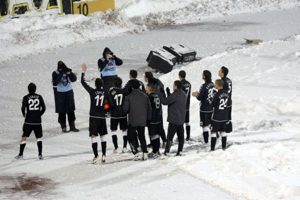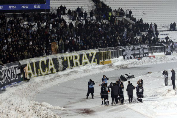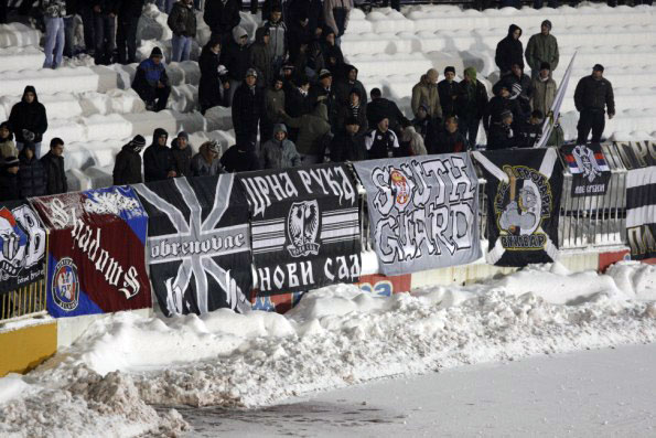 Финальный свисток, команда в полном составе(!) идет благодарить своих болельщиков, хлопают друг другу – у нас такое тоже иногда можно увидеть. Затем фан-сектор заводит песню, со словами «Партизан – чемпион!», и футболисты вместе с тренером не только подпевают, но и подтанцовывают, сливаясь с фанами в единый ансамбль. Минута и футболисты не уходят в раздевалку, а...- начинают лепить снежки и пулять друг в друга и по трибунам, за что сразу же получили в ответ от сотен своих друзей. Да, да, именно друзей, потому что такие отношения между болельщиками и командой кроме как дружбой назвать нельзя. К огромному сожалению, увидеть что-нибудь подобное в Украине не возможно, и вряд ли что-то измениться в ближайшее время...- Занавес.