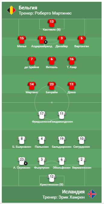 Бельгия: Миньоле – Алдервейрелд, Боята, Вертонген – Менье (Карраско, 67), Ванакен (Онана, 46), Витсель (Батшуайи, 67), Кастань– Лукаку (Троссард, 27) , де Брюйне, Э. Азар (Мертенс, 46)