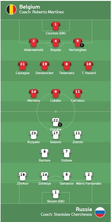 Getty Images/Global Images Ukraine Сегодня сборная Бельгии в своем стартовом матче на Евро-2020 в Санкт-Петербурге сыграет с Россией. Начало матча – в 22:00 по Киеву. Стали известны стартовые составы команд: Бельгия: Куртуа, Альдервейрельд, Боята, Вертонген, Кастань, Тилеманс, Карраско, Дендонкер, Лукаку, Мертенс, Торган Азар Россия: Шунин, Жирков, Джикия, Семенов, Марио Фернандес, Баринов, Оздоев, Кузяев, Головин, Зобнин, Дзюба ![]()
